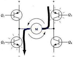 下圖所示為另一對三極管Q2和Q3導通的情況,電流將從右至左流過電機。當三極管Q2和Q3導通時,電流將從右至左流過電機,從而驅動電機沿另一方向轉動(電機周圍的箭頭表示為逆時針方向)。