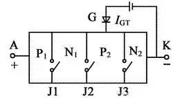 晶閘管是四層三端器件,它有 J1、J2、J3 三個 PN 結,可以把它中間的 NP 分成兩部分,構成一個 PNP 型三極管和一個 NPN 型三極管的復合管。