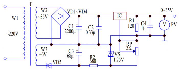 本電路通過變壓器 T 把 220V 的交流電壓加在一次側 W1 后,在二次側 W2 和 W3 分別得到 35V 和 6V 的交流電壓,二次側 W2 端通過二極管 VD1~VD4 整流、電容器 C1、C2 濾波后輸入到 IC 三端集成穩壓電路的輸入端,通過由 IC 穩壓集成電路、電阻器 R1 和電容器C4 輸出 35V 的直流電壓。二次側的 W3 線圈輸出的 6V 的交流電壓通過二極管 VD5、電容器 C3、電阻器 R2 和穩壓二極管 VS 輸出一個-1.25V 的負電壓作為輔助電源。變阻器 RP加在 IC 集成電路的控制端,通過調節變阻器 RP 能夠使輸出端輸出 0~30V 的直流電源。
