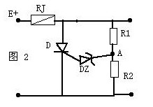 如圖2是一個電視機常用的過壓保護電路,當E+電壓過高時A點電壓也變高,當它高于穩壓管DZ的穩壓值時DZ道通,可控硅D受觸發而道通將E+短路,使保險絲RJ熔斷,從而起到過壓保護的作用。