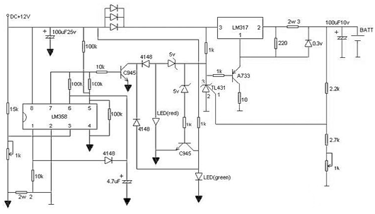 本電路顯示充電狀態,紅燈閃正在充,綠燈閃馬上要充滿,綠燈亮完全充滿。只要您有12V的電源就可以,接完電路后先別裝電池,調右下角的可調電阻,使電池輸出端為4.2V,再調左下角的可調電阻使LM358第三腳為0.16V就可以了,充電電流為380mA,超快,三個并連的二極管是降壓的,防止LM317過熱,且LM317須加散熱片,圖中的三極管可以任意型號。