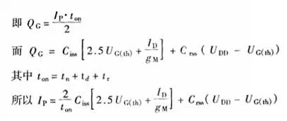 圖6的UGS波形包括了這樣幾部分:UGS第一段是快速上升到門限電壓;UGS第二段是比較緩的上升速度以減慢漏極電流的上升速度,但此時的UGS也必須滿足所需的漏極電流值;UGS第四段快速上升使漏極電壓快速下降;UGS第五段是充電到最后的值。當然,要得到完全一樣的驅動波形是很困難的,但是可以得到一個大概的驅動電流波形,其上升時間等于理想的漏極電壓下降時間或漏極電流上升的時間,并且具有足夠的尖峰值來充電開關期間的較大等效電容。該柵極尖峰電流IP的計算是:電荷必須完全滿足開關時期的寄生電容所需。