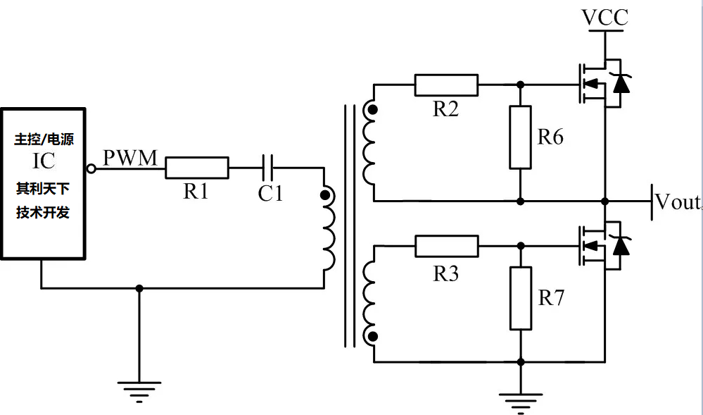 為了滿足高端MOS管的驅動,經常會采用變壓器驅動。其中R1目的是抑制PCB板上寄生的電感與C1形成LC振蕩,C1的目的是隔開直流,通過交流,同時也能防止磁芯飽和。