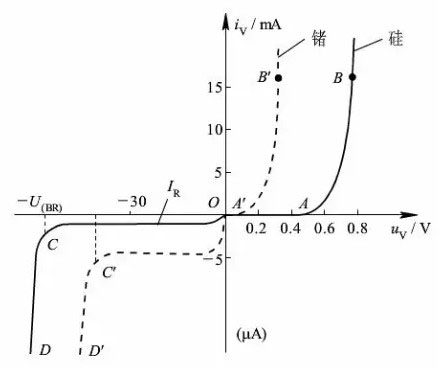 當(dāng)正向電壓超過門檻電壓時(shí),正向電流就會(huì)急劇地增大,二極管呈現(xiàn)很小電阻而處于導(dǎo)通狀態(tài)。這時(shí)硅管的正向?qū)▔航导s為0.6~0.7V,鍺管約為0.2~0.3V,如圖中AB(A′B′)段。